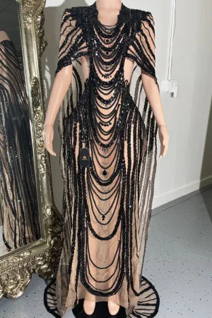 Introducing the Gabrielle Dress in Black and Ivory a stunning drop-waist gown that blends luxurious mixed materials for a truly unique look. The fully hand-beaded bodice adds intricate texture and sparkle, while the contrast crepe skirt flows gracefully for a flattering silhouette. With a hidden zipper closure at the back, this elegant dress offers a seamless and polished finish.